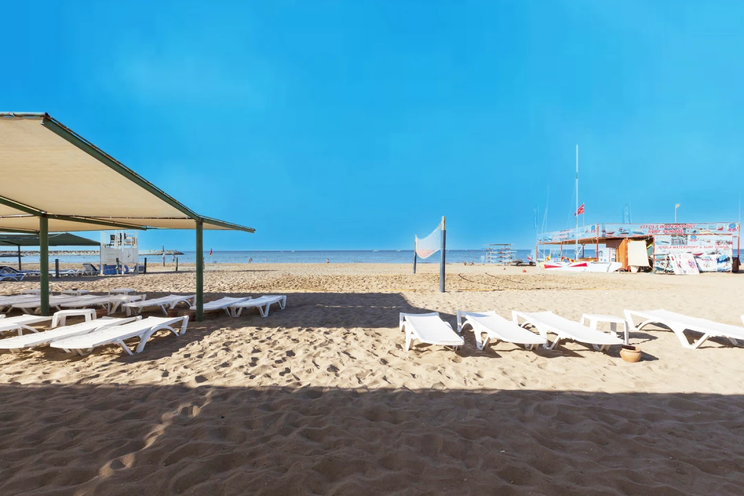 Der Strand ist nur etwa 250 Meter vom Hotel entfernt, sodass du entspannt zu Fuß gehen kannst.